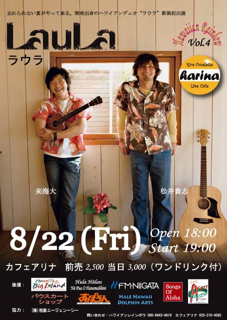 8月22日土曜日 ハワイアンデュオのラウラが新潟カフェアリナにやってきます。
